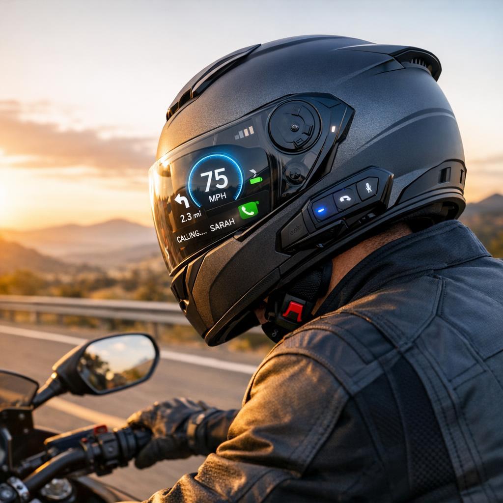 Manche Smart-Helme verfügen über integrierte Kameras, die Fahrten aufzeichnen oder als Rückspiegel dienen können. Augmented Reality (AR) projiziert wichtige Informationen direkt ins Sichtfeld, etwa Geschwindigkeit oder Navigationshinweise.